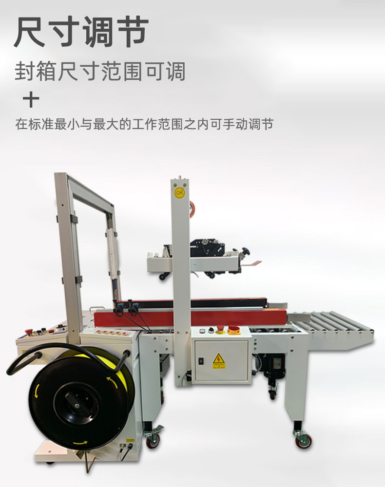 • 適用范圍廣:可以對各種尺寸和形狀的箱子進行封箱打包,只要箱子的尺寸在機器的設計范圍內。通過調整相關的參數和部件,如輸送帶寬度、折頁板位置、打包帶長度等,能夠適應不同類型的包裝需求,具有很強的通用性。